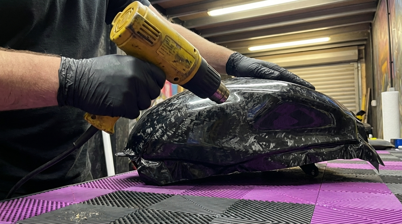 Le réservoir présente des courbes concaves et convexes extrêmes. Les carénages latéraux, les têtes de fourche et les passages de roue exigent une maîtrise parfaite du thermoformage. Chez VossAuto, nous appliquons des films haut de gamme capables d'encaisser les contraintes thermiques (proximité du bloc moteur) et aérodynamiques, sans se rétracter ni buller avec le temps.