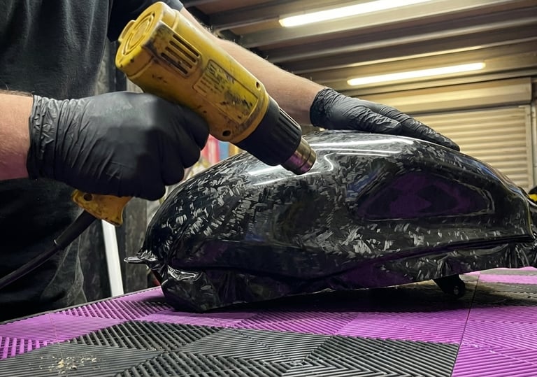 Le Covering Partiel & Éléments : Nous ciblons des pièces spécifiques pour donner une touche d'agressivité. Il s'agit généralement d'appliquer un covering carbone sur un lèche-roue, d'habiller uniquement le réservoir, ou de passer des écopes latérales en noir mat.
